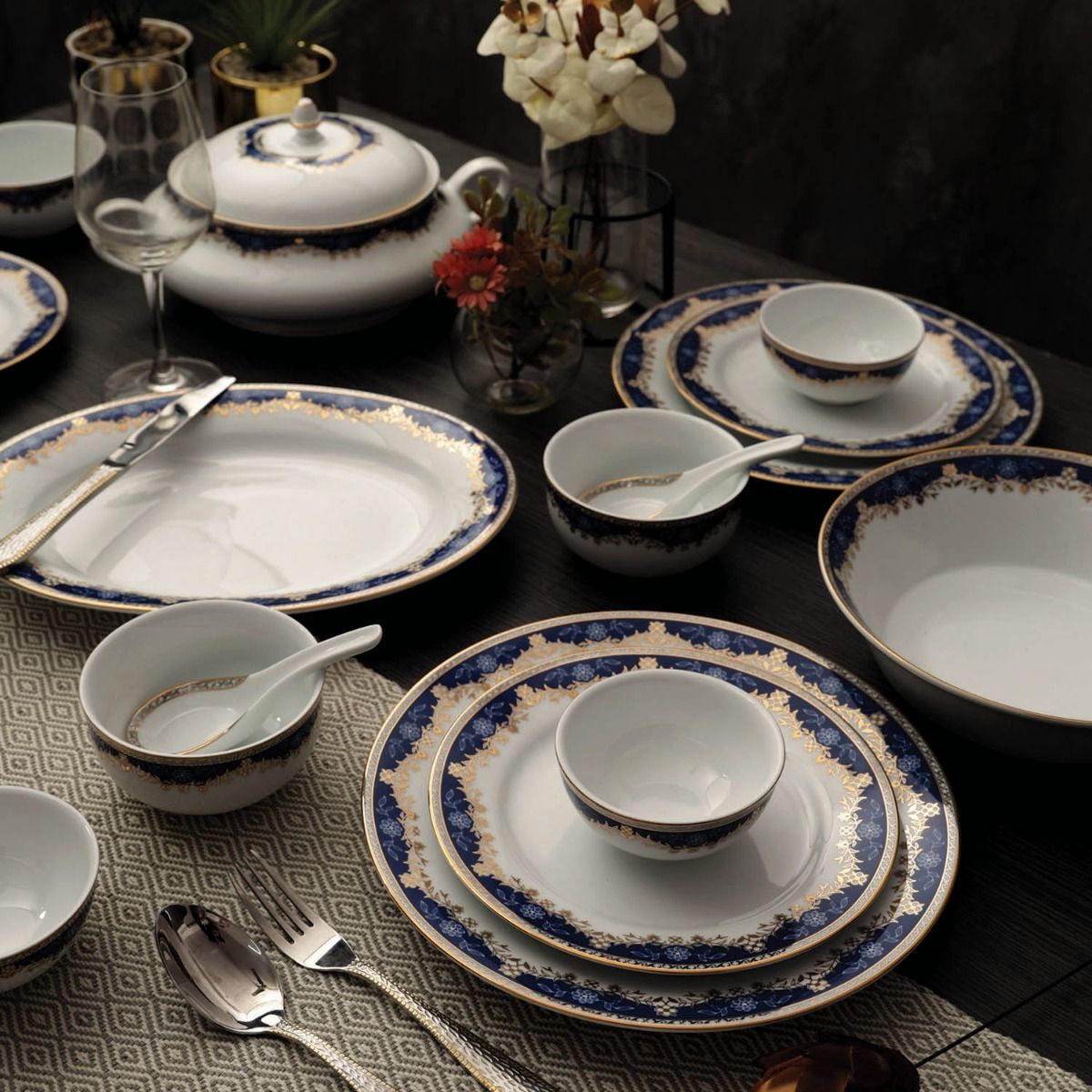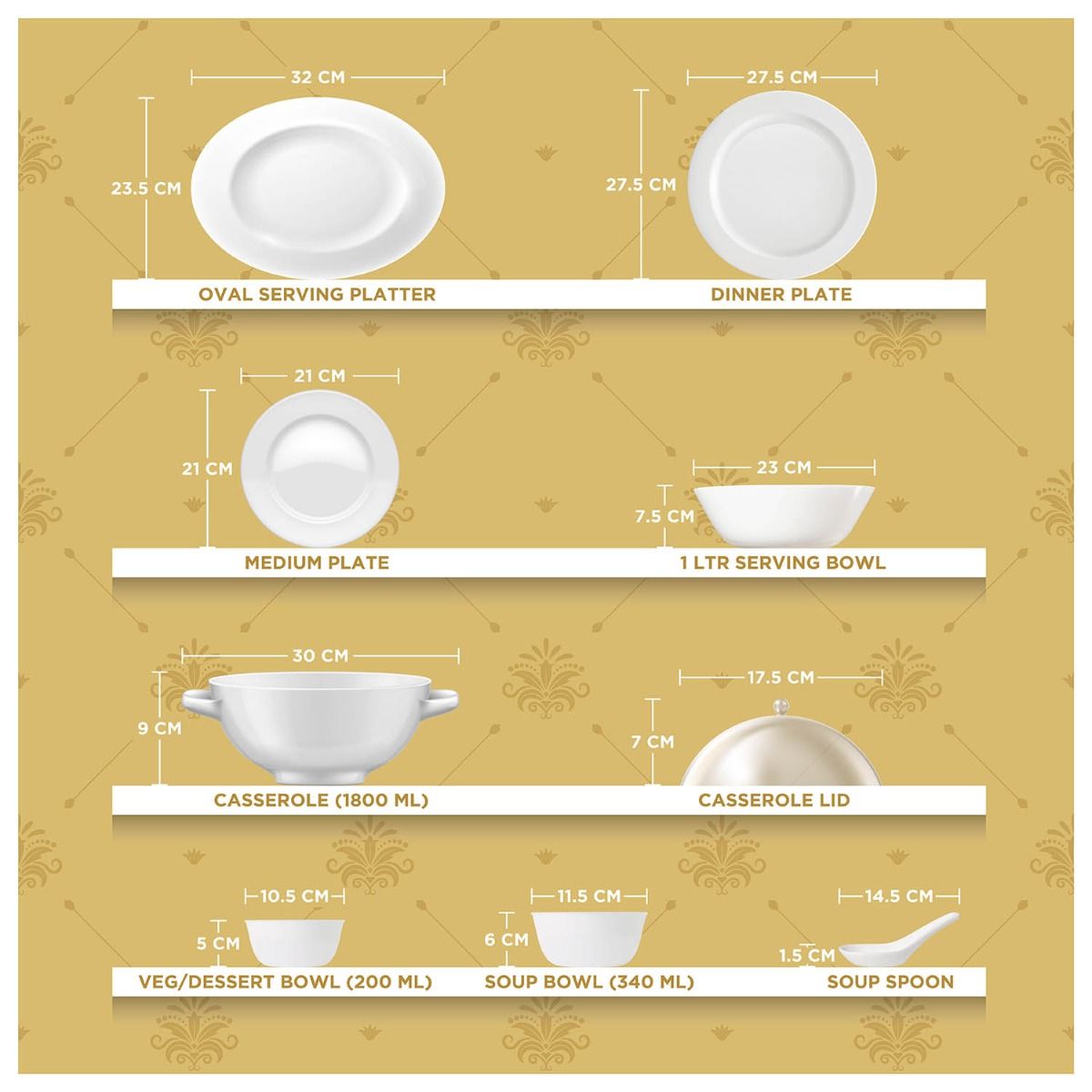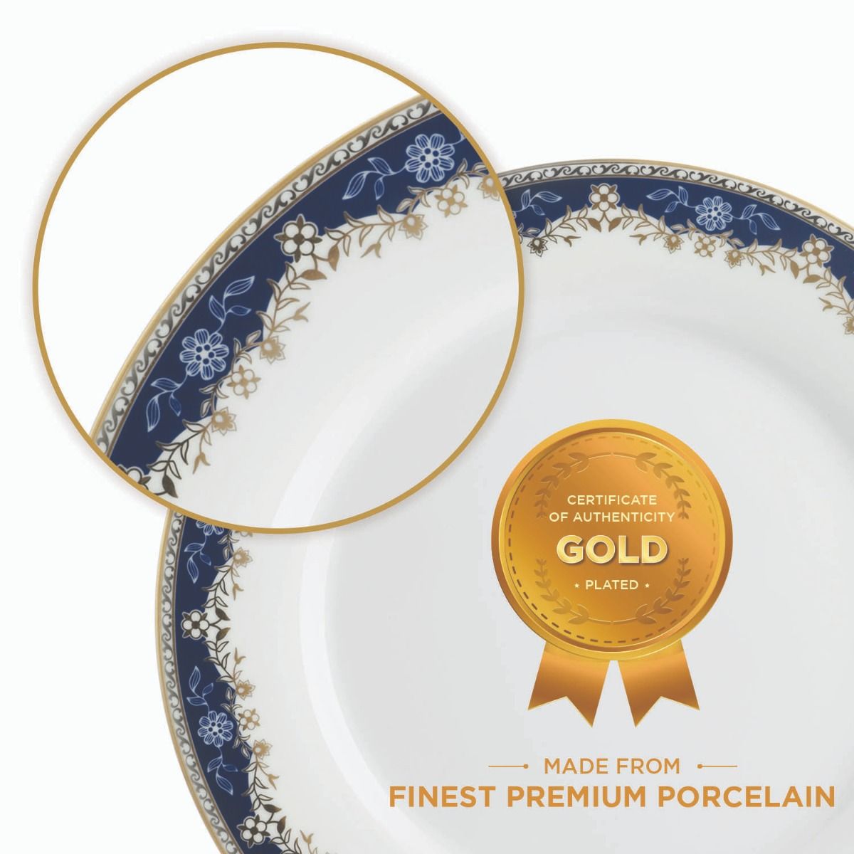 Let elegance sit atop your dining table with the Aurora 45-piece dinner set from Peggy Oliver. Curated in the USA, this set is created with a distinguished design making it a timeless collection. Blue and white floral design hemmed with a gold pattern on both sides with a pristine white base gives it a royal feel.