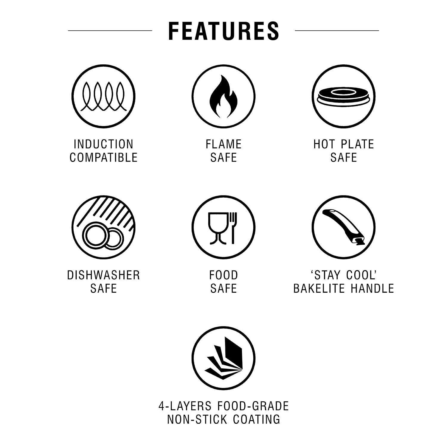 The 4- layer non-stick coating ensures even distribution of heat for quicker cooking with minimum use of oil, while the ergonomically designed bakelite handles offers a safe and comfortable grip.